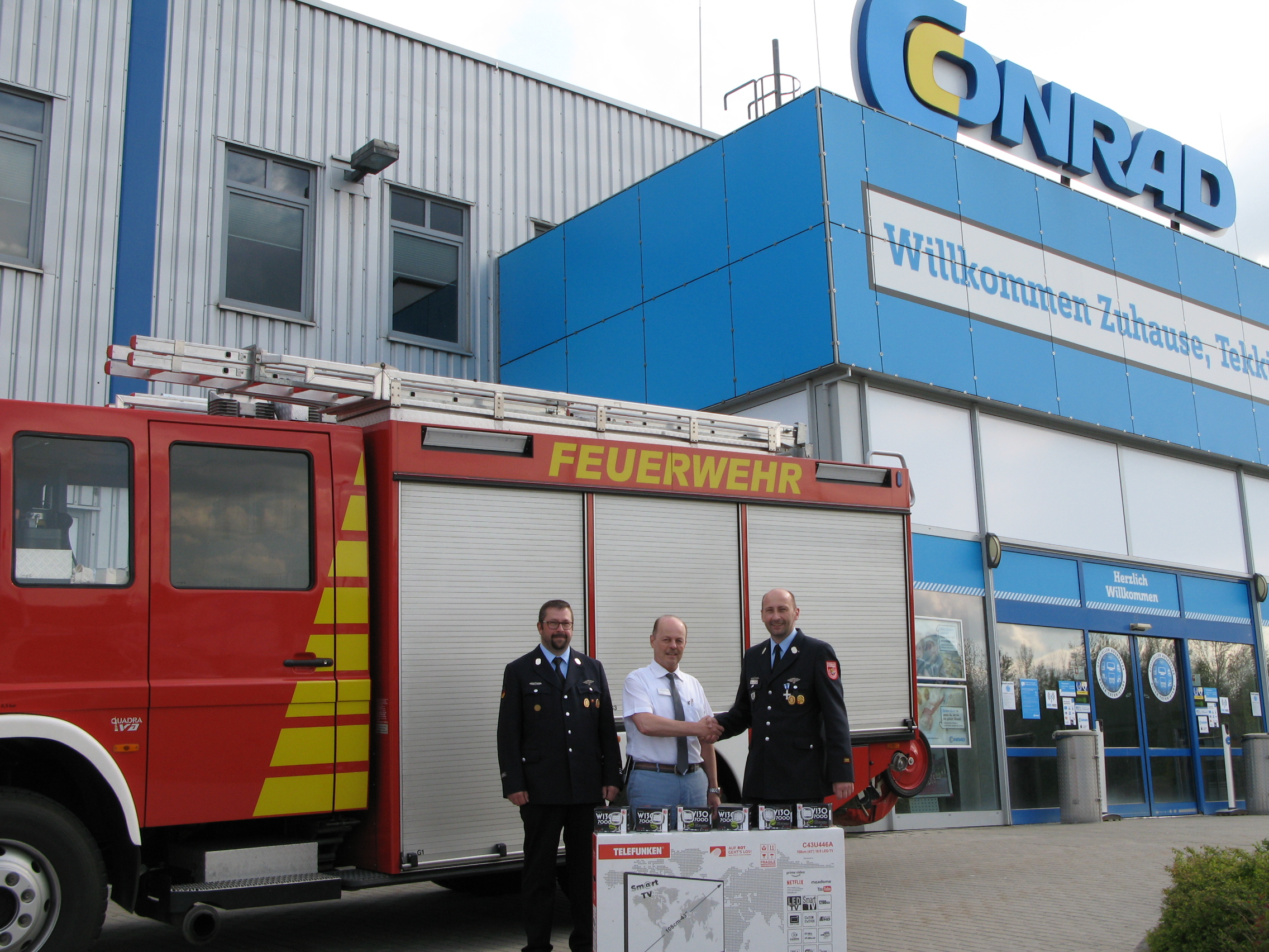 Wernberg-Köblitz, am 04.05.2019. Begangen wird dieser Tag seitdem alljährlich am 4. Mai, dem Namenstag des heiligen Florian von Lorch und Schutzpatron der Feuerwehr. Aus diesem Anlass hat Conrad Electronic der Freiwilligen Feuerwehr Oberköblitz eine großzügige Sachspende zukommen lassen: Bei der Spende handelt es sich um zwei LED-Arbeitsscheinwerfer für weitreichende Ausleuchtung, vier LED-Arbeitsscheinwerfer für die Nahfeldausleuchtung sowie einen LED-TV-Monitor mit einer Bilddiagonalen von 109 Zentimetern.