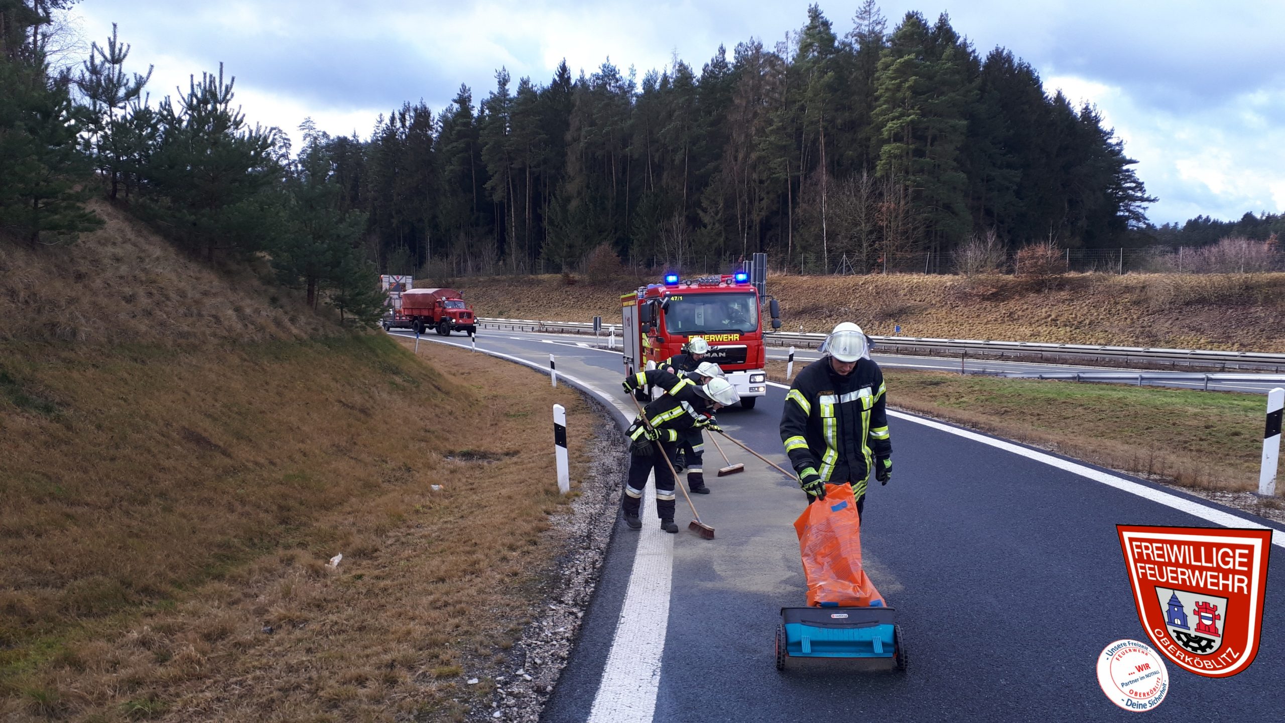 Zu einer längeren Ölspur wurden wir auf die A6 zwischen den Autobahnkreuz Opf. Wald und Wernberg-Ost alarmiert. Wir reinigten den Bereich zwischen den AK und der Ausfahrt Wernberg-Ost und die ebenfalls alarmierte Feuerwehr Wernberg übernahm den Bereich von der SAD30 und B14 bis zur Ortsmitte von Wernberg.