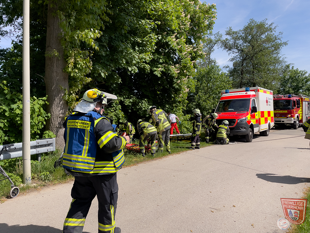 Im Uferbereich stürzte einen Person einen Abhang hinunter. Wir unterstützen den Rettungsdienst, bei der Erstversorgung und der anschließenden Rettung aus dem unwegsamen Gelände.