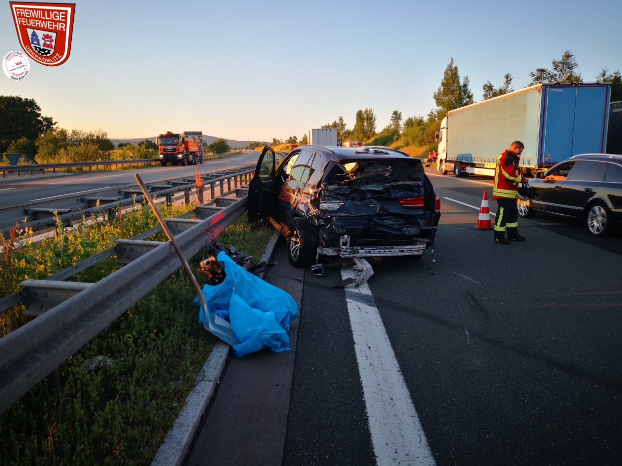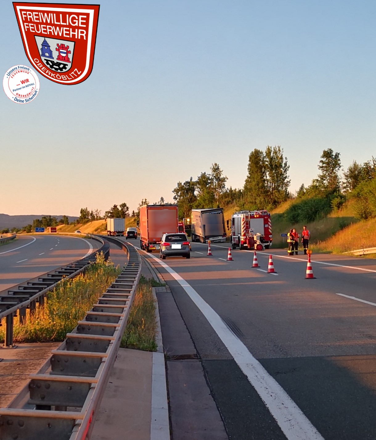 Dort war ein PKW auf einen LKW aufgefahren. Die ursprüngliche Einsatzmeldung einer eingeklemmten Person bestätigte sich zum Glück nicht. Unsere Aufgabe war die Absicherung und Verkehrslenkung an der Unfallstelle.