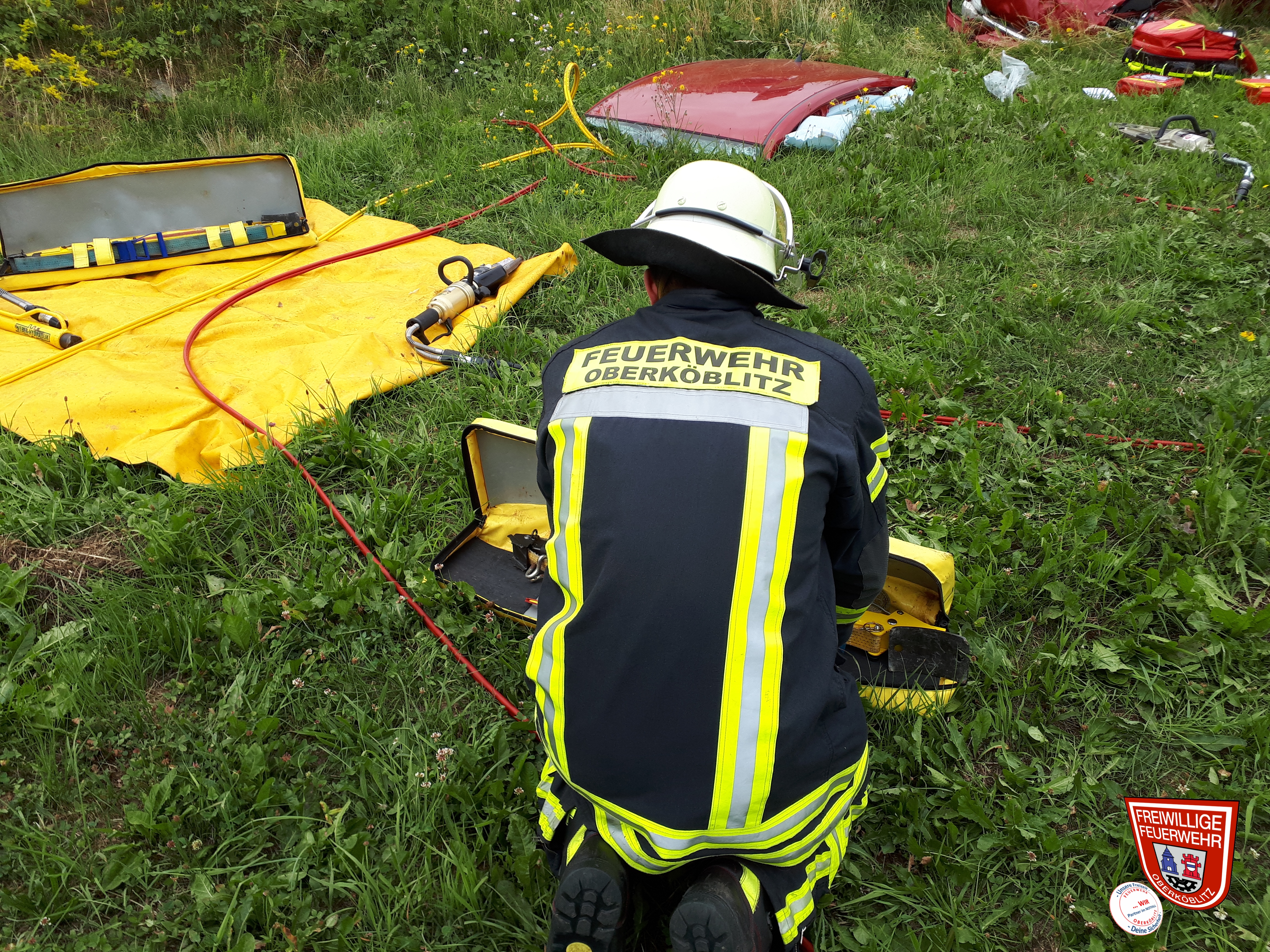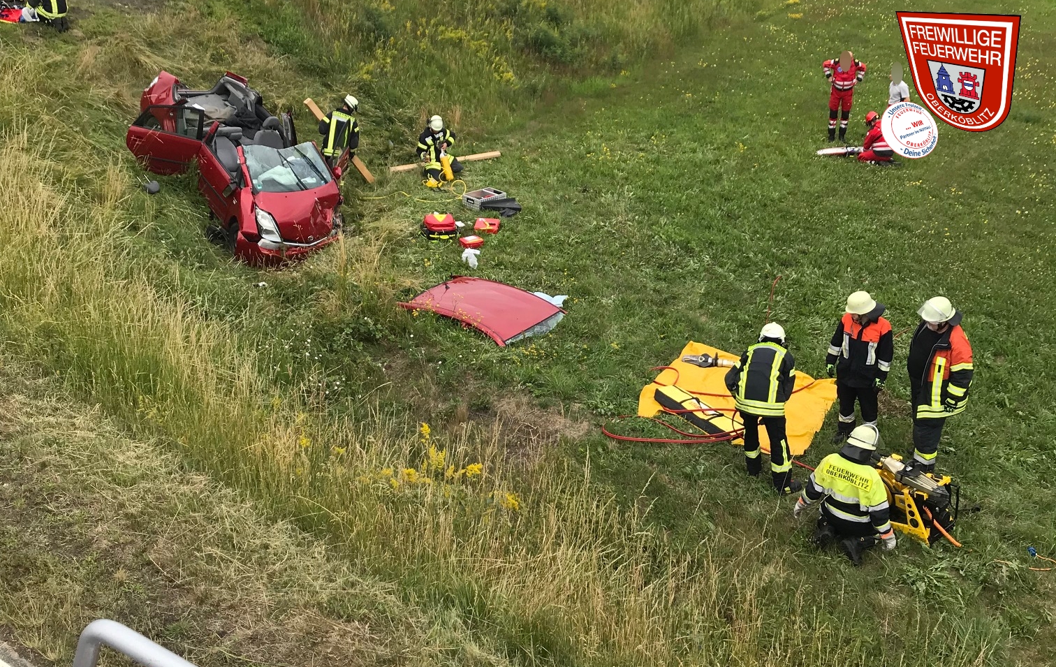 Durch den Zusammenstoß im Kreuzungsbereich kam ein Fahrzeug von der Fahrbahn ab und am Ende der Böschung zum stehen. Es musste hydraulisches Rettungsgerät eingesetzt werden, um eine Person des Fahrzeuges patientenschonend aus dem Fahrzeug zu retten. Dazu wurde das Fahrzeug stabilisiert und anschließend mit der Rettungsschere das Dach abgenommen.