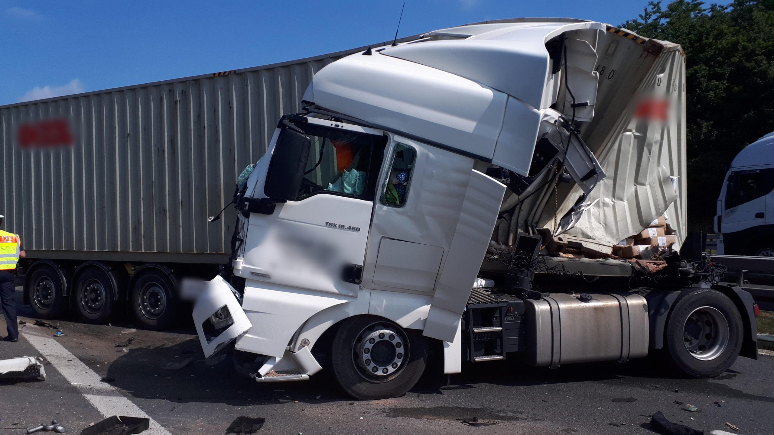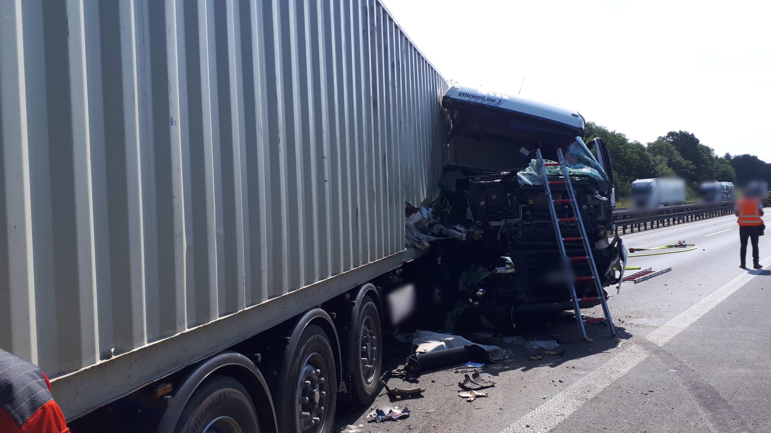 Nachdem der zweite LKW ebenfalls geborgen war, wurde durch ein Entsorger die Fahrbahn gewaschen und endgereinigt.
