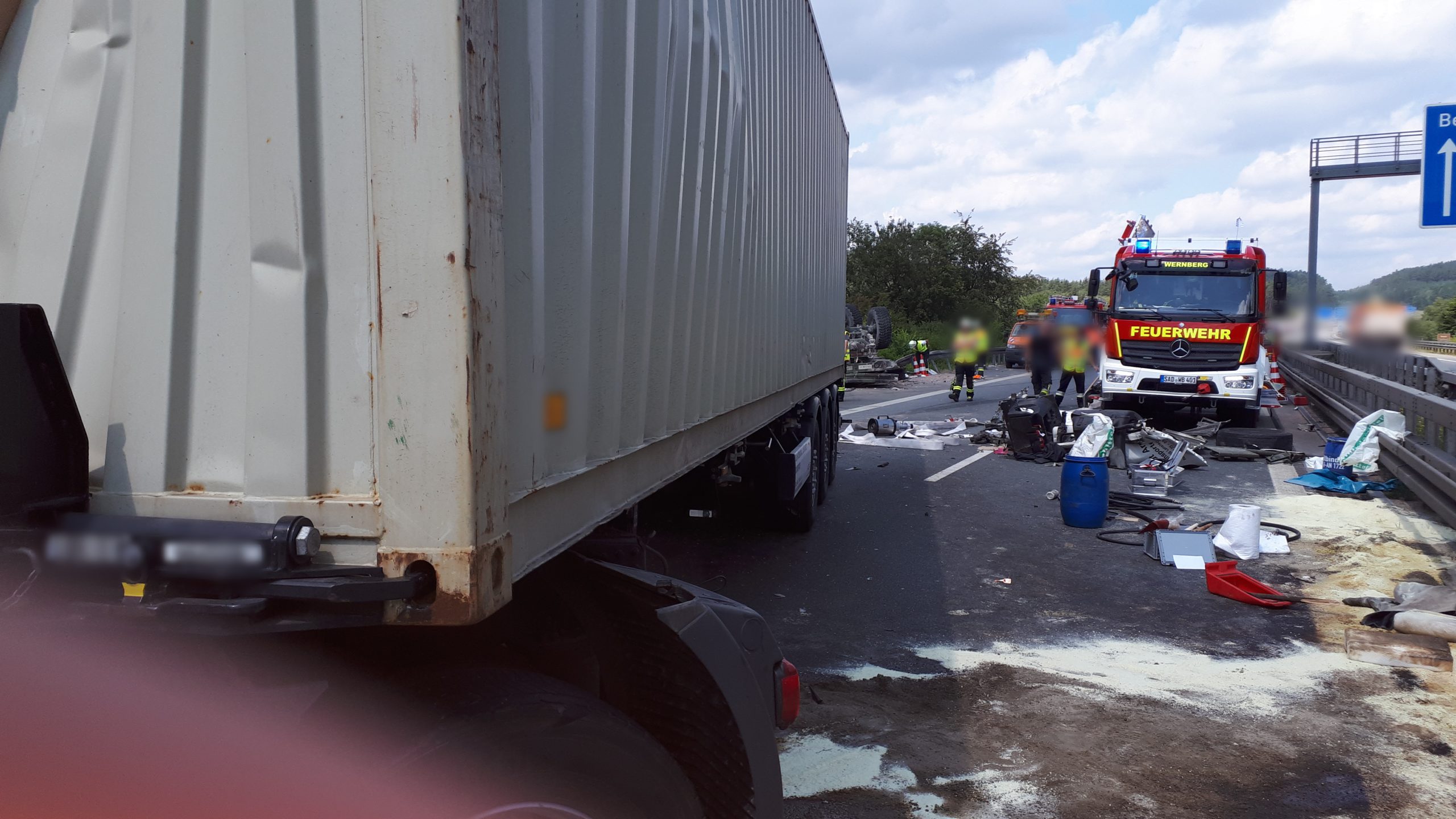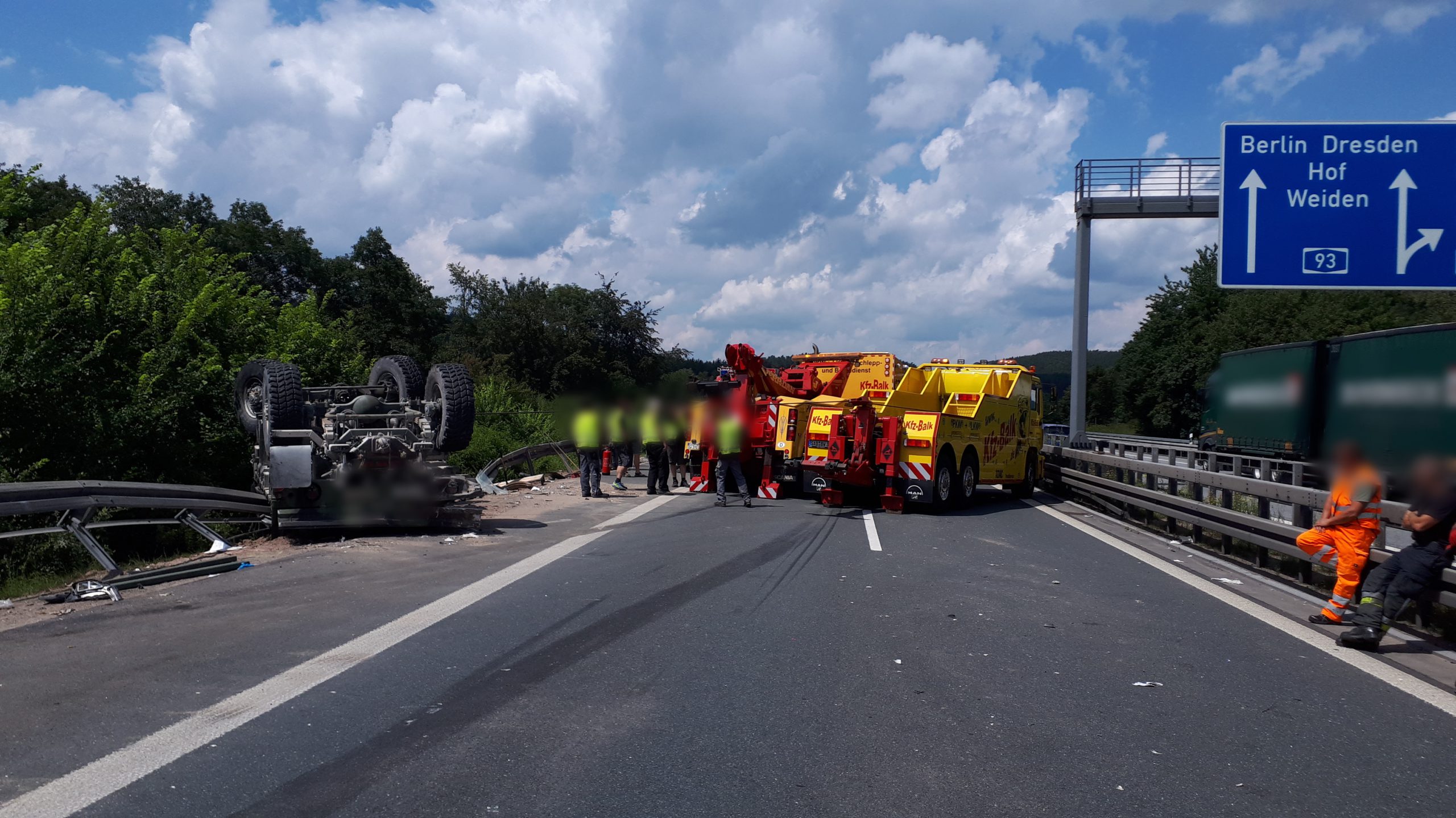 Wir wurden zusammen mit mehreren Feuerwehren von der ILS Amberg auf die A93 in FR Süden alarmiert. Hier war gegen 9.50 Uhr ein Militär-Lkw der amerikanischen Streitkräfte kurz nach dem Autobahnkreuz „Oberpfälzer Wald“ wegen eines Motorschadens auf dem Seitenstreifen zum stehen gekommen. Aus bisher ungeklärter Ursache kam ein Sattelzug zu weit nach rechts und rammte das Militärfahrzeug. Dadurch kippte dieses um und blieb auf dem Dach liegen. Der Sattelzug knickte ein und versperrte die Autobahn.