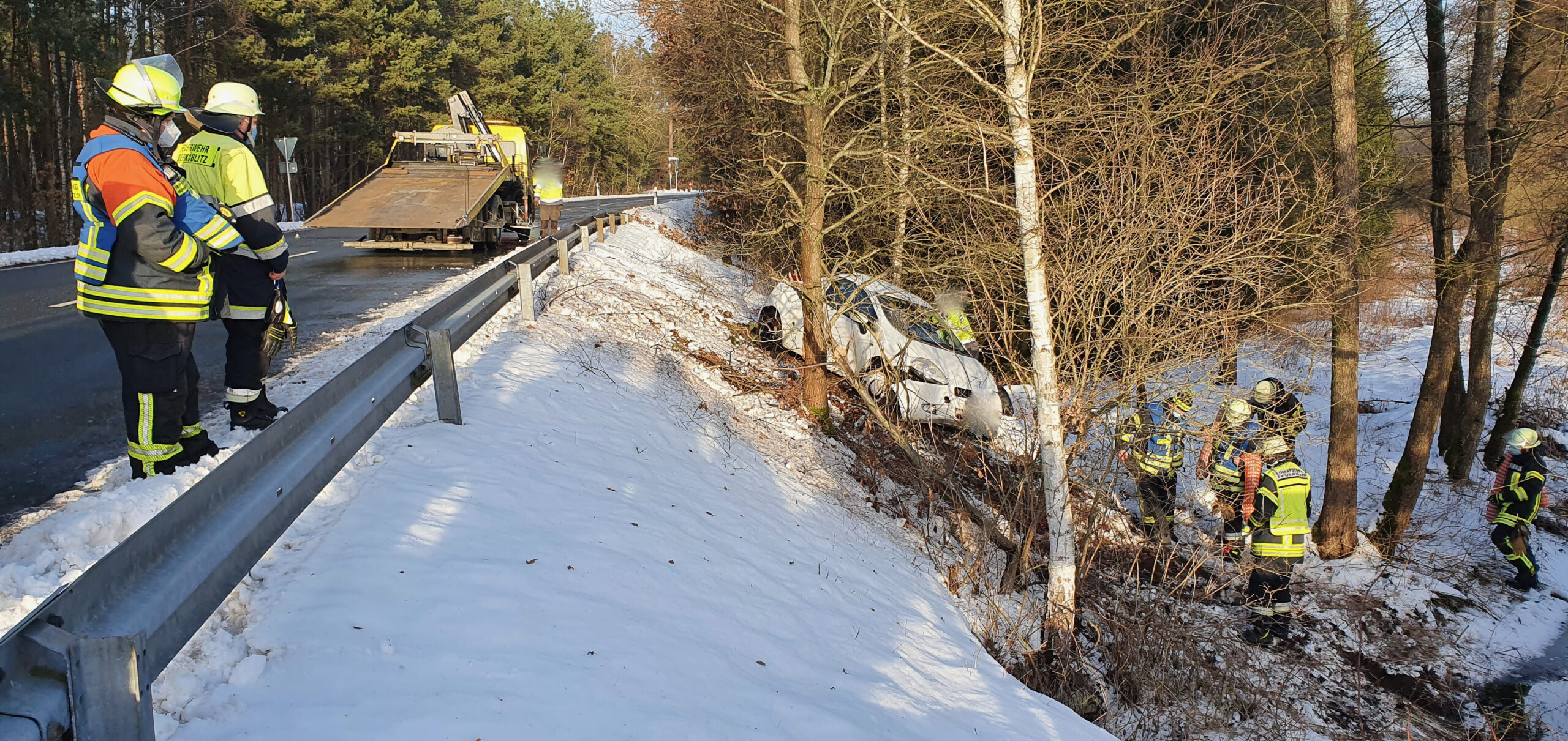 Zwischenzeitlich erreichte uns die Meldung eines weiteren Verkehrsunfall zwischen Kettnitzmühle und Grünau. Das abgerückte HLF der FF Wernberg übernahm diesen Einsatz. Auch hier war ein PKW in einem Waldstück aufgrund Glätte von der Fahrbahn abgekommen.