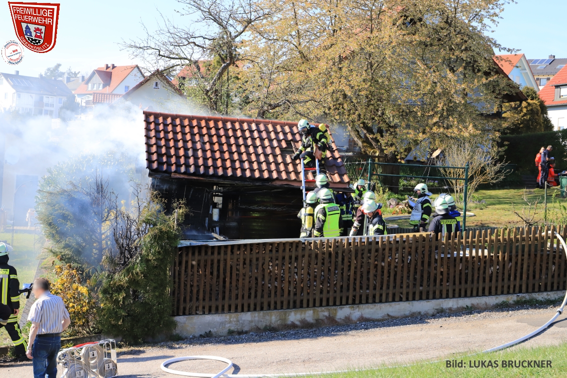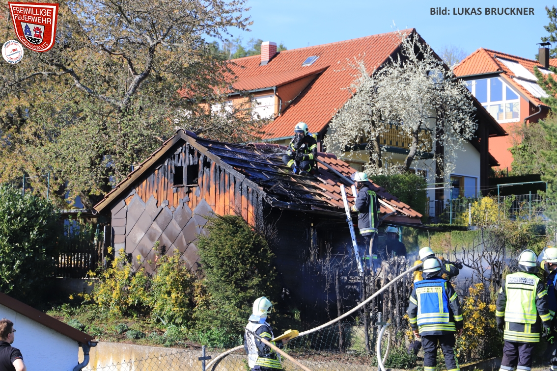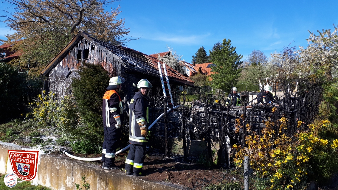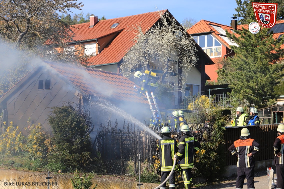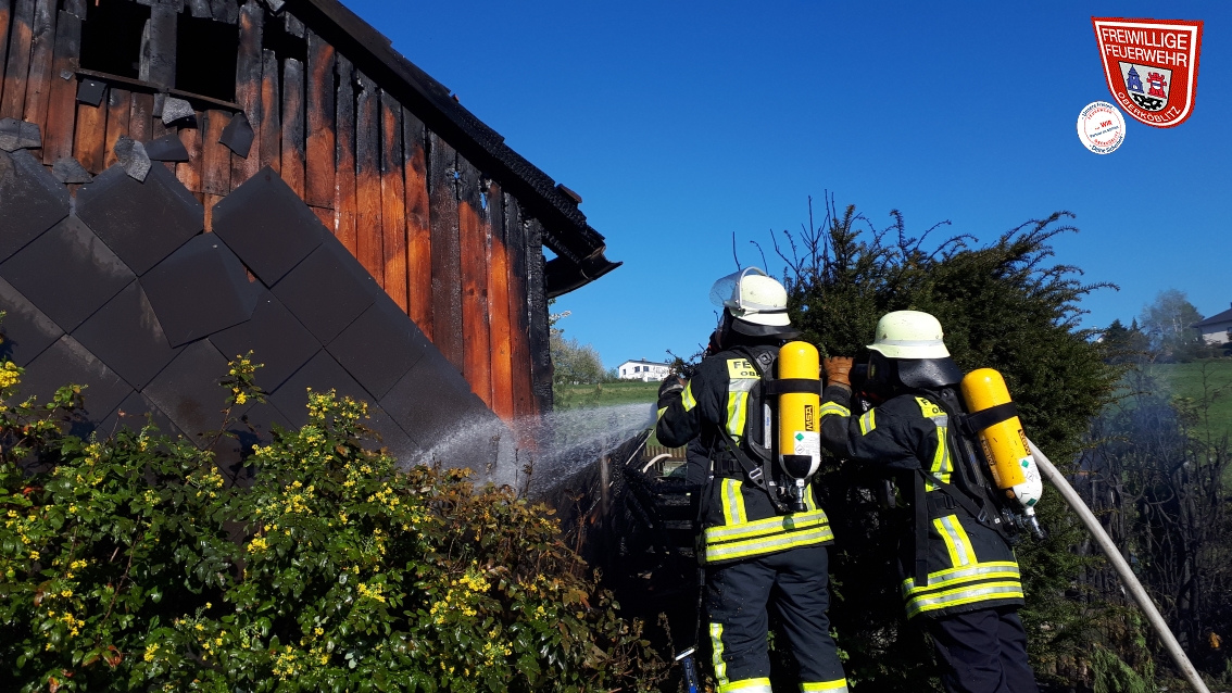 Im Verlauf des Einsatzes musste das Dach des Gartenhauses abgedeckt und geöffnet werden, um die darunter liegenden Glutnester abzulöschen. Dazu musste auch eine Vertäfelung, die an sich an der Giebelseite befand, entfernt werden.