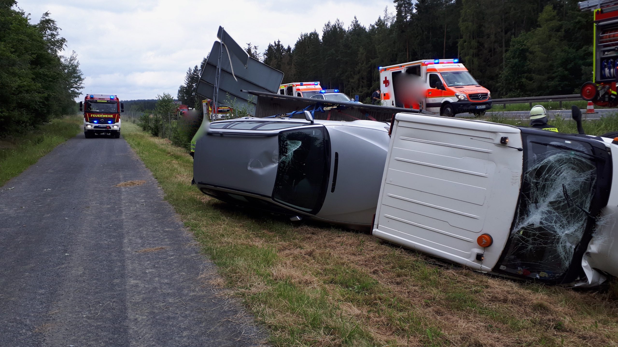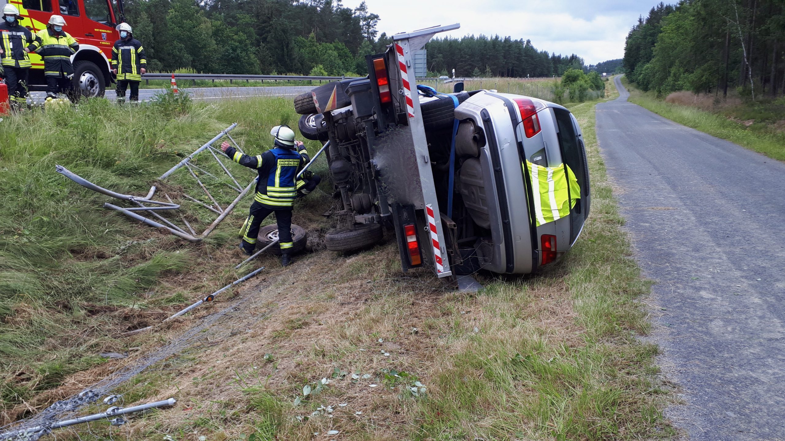 Wir wurden zusammen mit mehreren Feuerwehren von der ILS Amberg auf die A93 in FR Süden alarmiert. Hier war gegen 9.50 Uhr ein Militär-Lkw der amerikanischen Streitkräfte kurz nach dem Autobahnkreuz „Oberpfälzer Wald“ wegen eines Motorschadens auf dem Seitenstreifen zum stehen gekommen. Aus bisher ungeklärter Ursache kam ein Sattelzug zu weit nach rechts und rammte das Militärfahrzeug. Dadurch kippte dieses um und blieb auf dem Dach liegen. Der Sattelzug knickte ein und versperrte die Autobahn.